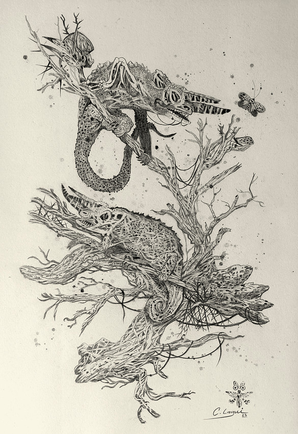 Bajo un cielo plomizo y una oscuridad que roe el alma, la vida se marchita en un suspiro. Sobre una rama retorcida como un grito de agonía, los camaleones se enfrentan a la desintegración. Sus escamas, que antes brillaban como gemas robadas a la luz, ahora se quiebran en un eco de polvo. La muerte no es un final, sino una lenta disolución en la negrura que los consume.