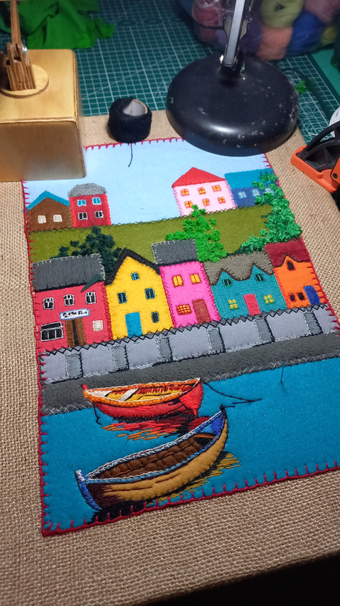Obra artesanal única, creada a partir de la unión de textiles seleccionados y bordado ornamental. Un diálogo entre texturas que transforma retazos en horizontes
