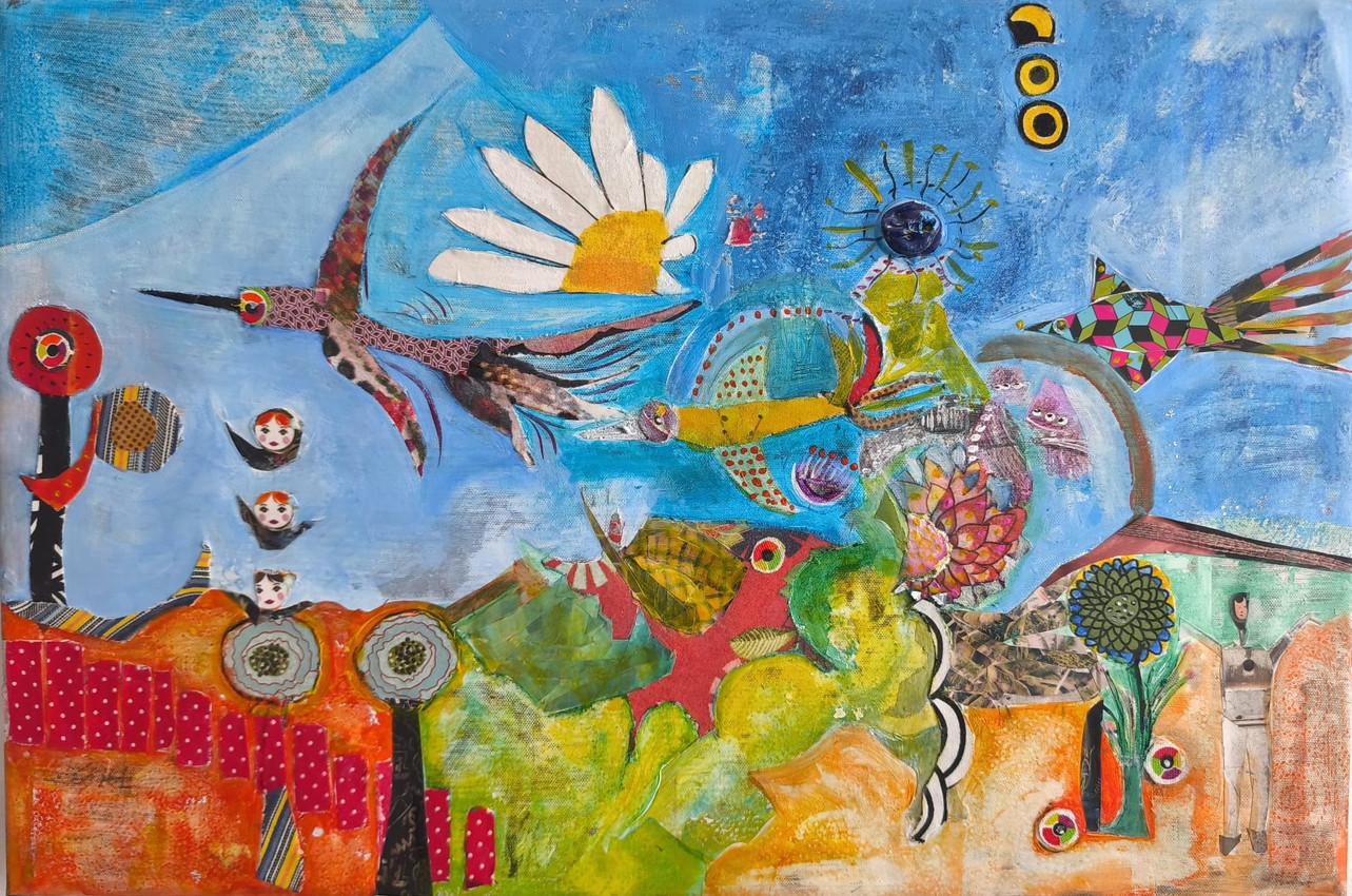 La obra combina collage y pintura para crear texturas ricas y contrastes vibrantes. Los verdes y amarillos terrestres dialogan con la profundidad del azul, mientras los detalles geométricos aportan ritmo y contemporaneidad. Cada elemento parece suspendido en un instante de movimiento, como si el mundo estuviera en proceso de reinvención.