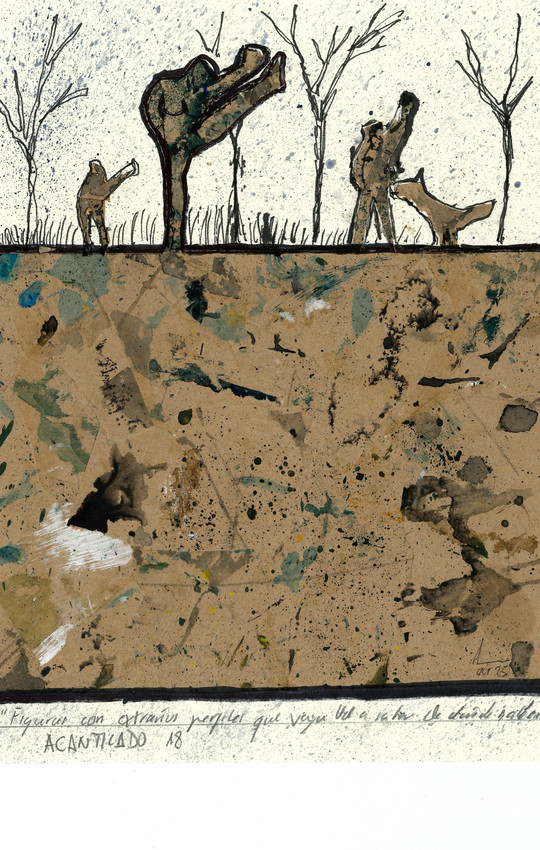 ACANTILADO 16. PARQUE pertenece a la serie Acantilados 2025 que juega a presentarnos escenas que contienen figuras humanas silueteadas en variadas circunstancias. Cada una de las composiciones se genera a partir de un elemento externo de papel que se superpone sobre toda la anchura de un formato A4. Dicho elemento ha sido previamente realizado mediante técnicas de pintura desde la acción y rastro que de ella queda en el soporte. Se utiliza la proyección de esmaltes, la transferencia por presión y la impresión de papel sobre papel...
