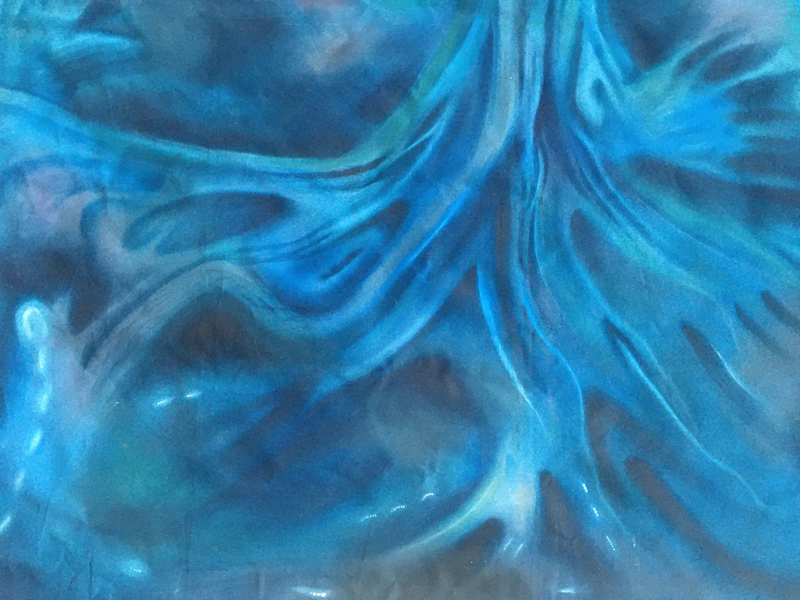 Obra al óleo, de árbol observado en una noche profunda del amazonas, en las que se vislumbran raíces y gusanos con cuerpos fluorescentes.