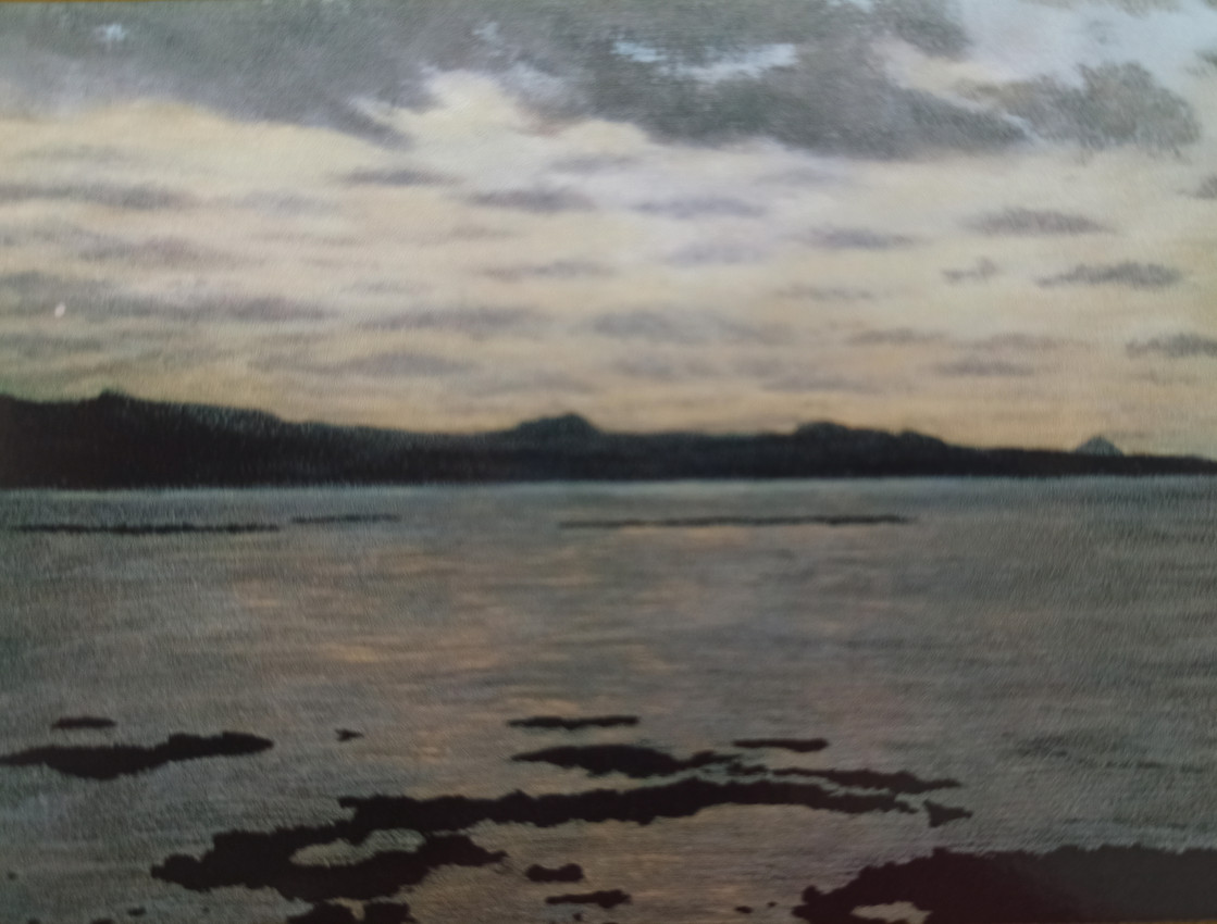 En primer plano se aprecian zonas oscuras de rocas parcialmente cubiertas por el agua. En el horizonte, una silueta montañosa se recorta contra un cielo cubierto de nubes grises y doradas, creando una atmósfera serena y melancólica.