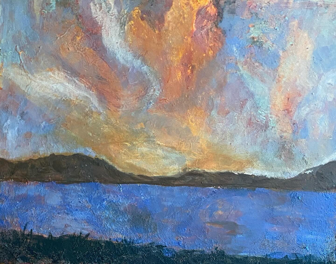 Atardecer Playa Pucura- Chile 2024, el resplandor del sol en las frías agua del Lago Califiquen del deshielo de la cordillera de los Andes, en fin del mundo, Chile.