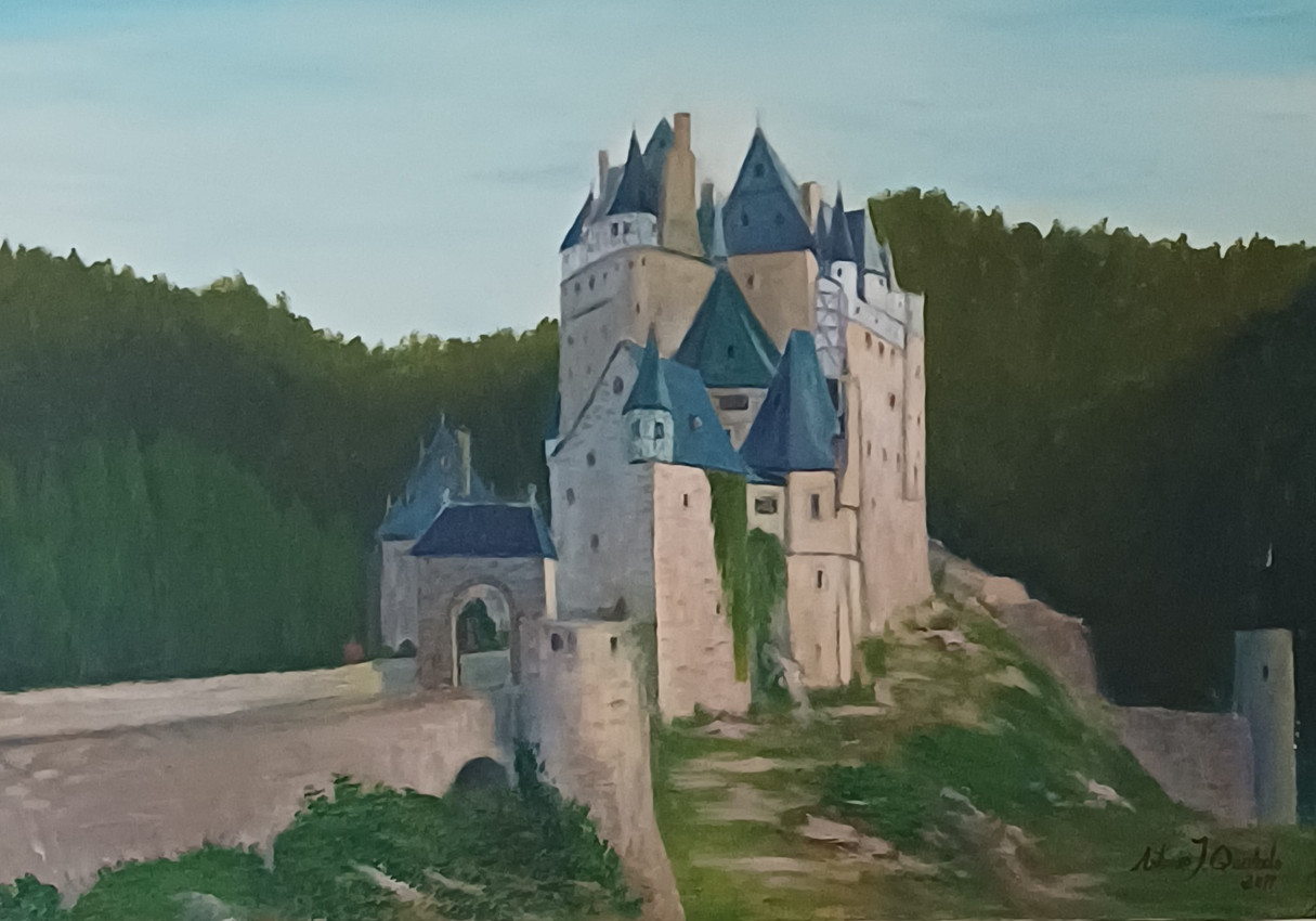 Acrílico sobre lienzo de 70 x 100 cm y 4 cm de ancho, que presenta una vista serena e imponente del Castillo de Eltz, enclavado en un frondoso valle. La composición horizontal realza la integración del castillo en su entorno natural, con un puente y vegetación que guían la mirada y crean profundidad.