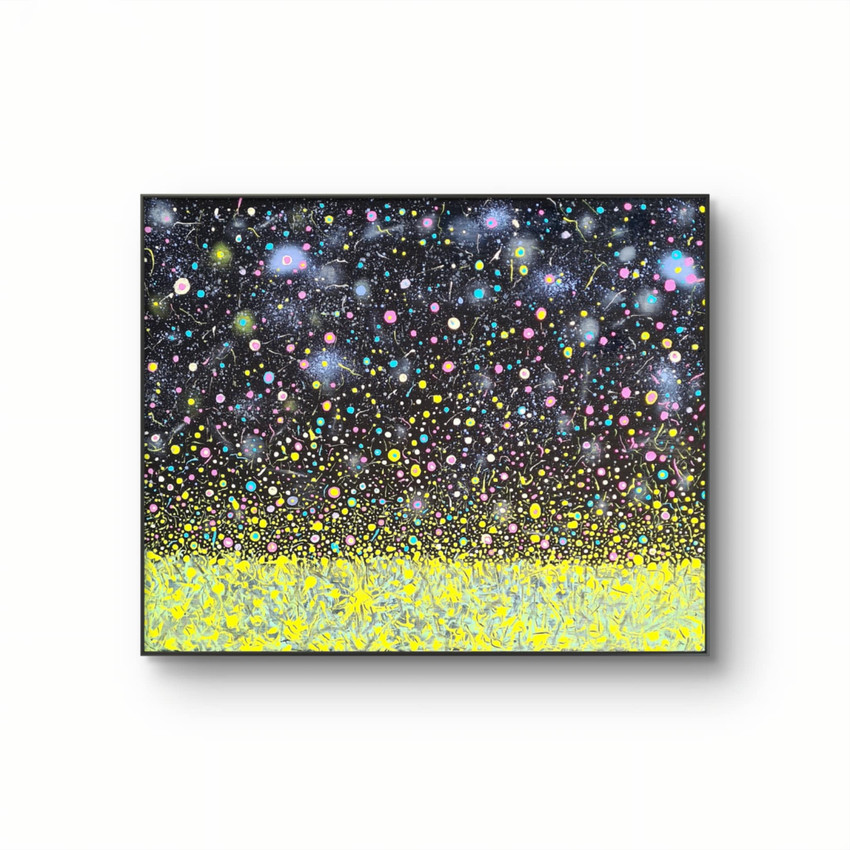 Celestial Bloom III is an abstract expression of a star-studded cosmos meeting a radiant field. A vibrant explosion of yellowish blooms rises into a night sky teeming with nebulae and multicolored stardust. Each dot and brushstroke celebrates the magic of growth, light, and mystery—inviting the viewer to contemplate the infinite beauty of the universe and the delicate chaos of nature.