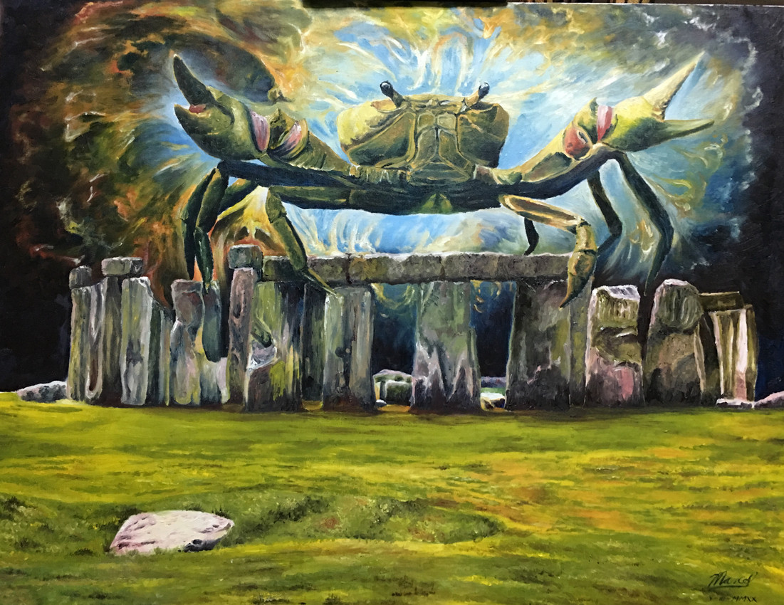 Esta obra fusiona lo místico y lo natural en una escena surrealista que captura la imaginación. Un majestuoso cangrejo gigante se erige imponente sobre la emblemática estructura de Stonehenge, envuelto en un aura de luces vibrantes y colores intensos que dan vida a un cielo dramático y misterioso. Las texturas ricas y los contrastes de luces y sombras invitan a un viaje visual donde lo antiguo y lo fantástico convergen. Un cuadro que desafía la realidad y encierra un simbolismo profundo, ideal para quienes buscan una experiencia artística única y evocadora.