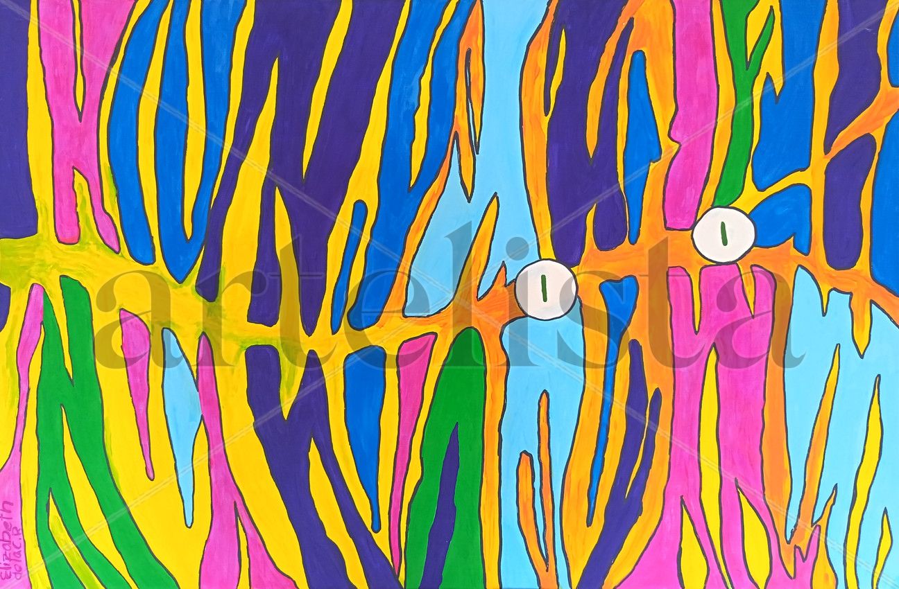 La paleta cromática, intensa y contrastada, combina azules profundos con amarillos, naranjas, verdes y magentas, sugiriendo la riqueza biológica del fondo marino y el constante movimiento del agua. Las líneas negras delimitan las formas como si se tratara de corrientes o grietas de luz que atraviesan el océano, aportando ritmo y tensión visual.