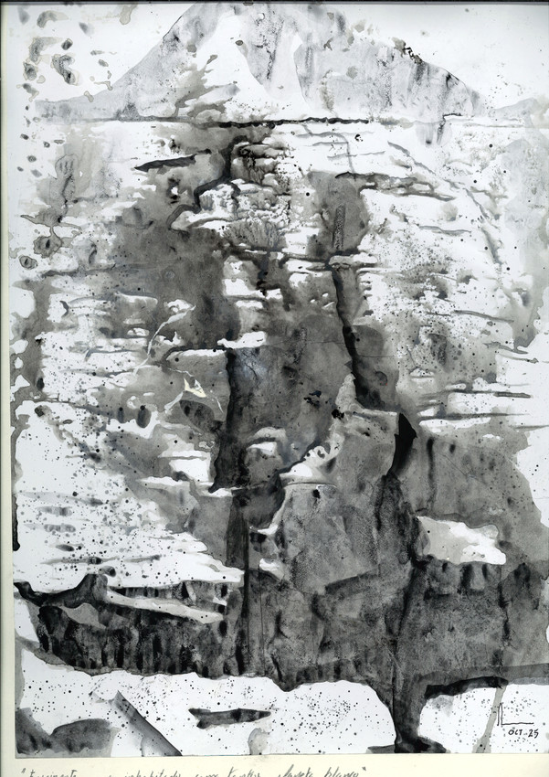 Obra sobre papel pegado sobre cartulina, realizada mediante goteo, proyección de tintas y esmaltes, transferencia por presión e impresión de papel sobre papel. Estas acciones generan fondos dinámicos que se desplazan hacia delante y hacia atrás, creando profundidad y tensión espacial. En ese movimiento aparecen restos de fachadas urbanas colgadas, arquitecturas fragmentadas y volúmenes geométricos erosionados.