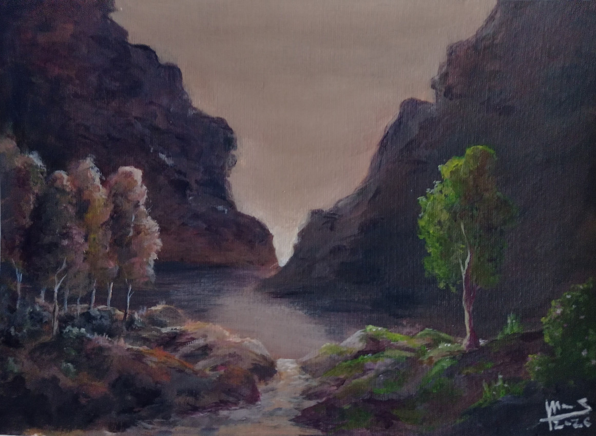 Esta obra es una profunda parábola visual sobre la psicología humana, donde la naturaleza se convierte en escenario de un conflicto emocional. Bajo la sombra de dos imperiosos acantilados rocosos, surge una 'batalla silenciosa' dividida por un arroyo que fluye hacia un lago en la base. He buscado atribuir a los elementos naturales sentimientos humanos complejos: a un lado, un grupo de árboles otoñales de tonos cálidos parecen envidiar o burlarse del árbol vibrante, verde y hermoso al otro lado, que permanece impasible ante el celo.