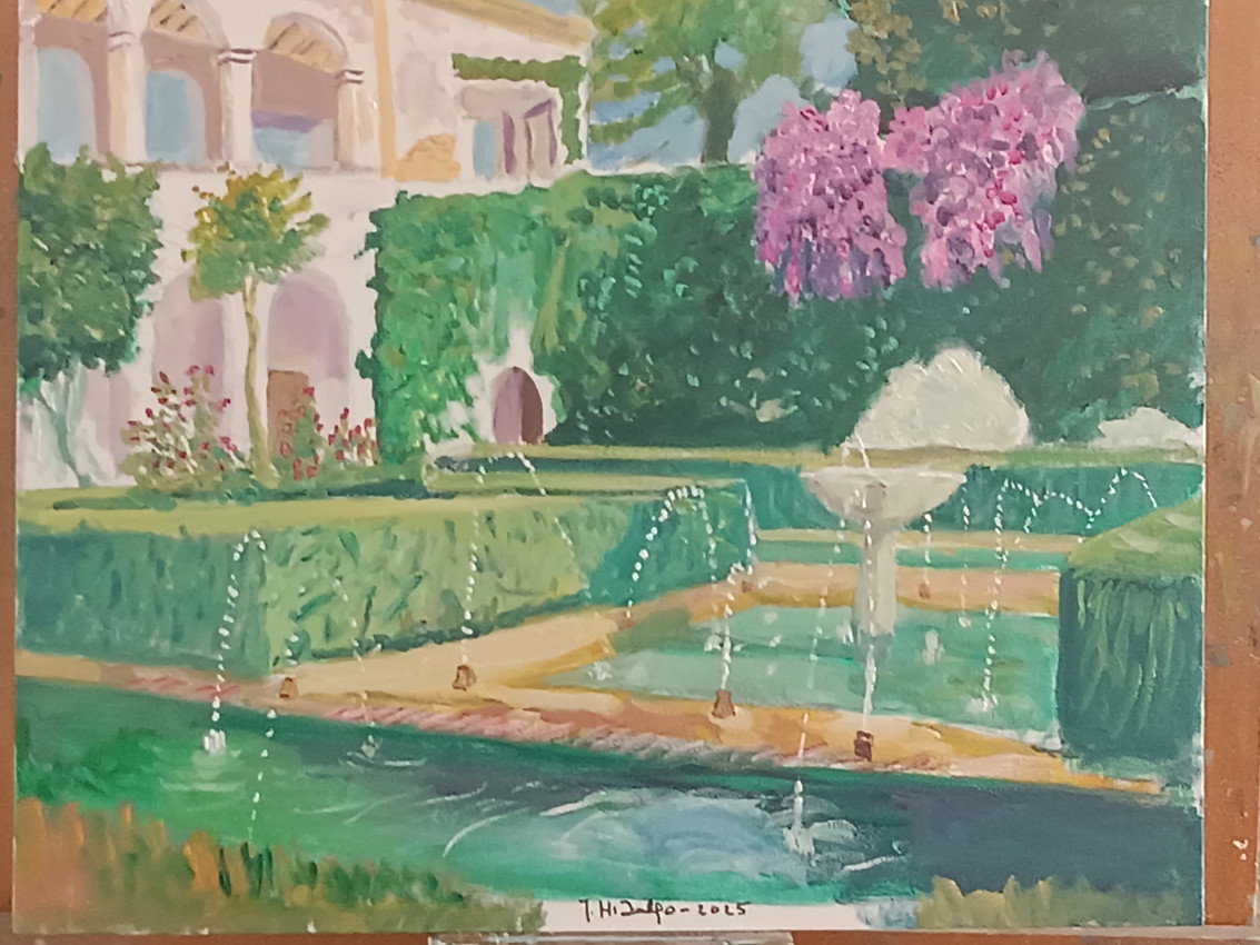 Paisaje delos jardines de la Alhambra, realizado al óleo utilizando el estilo impresionismo figurativo, donde la pincelada esta desarrollada de forma suelta donde la pintura resuelve la composición , la perspectiva aérea creando un visión uniforme y determinada del lugar captado, haciéndolo completamente reconocible.