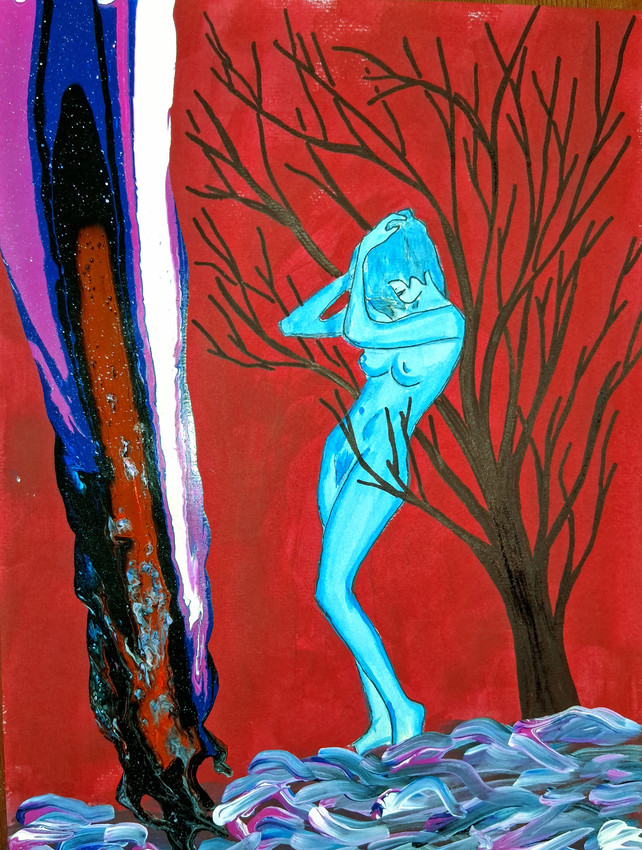 Una mujer desnuda abrazada por un árbol observa una cascada...