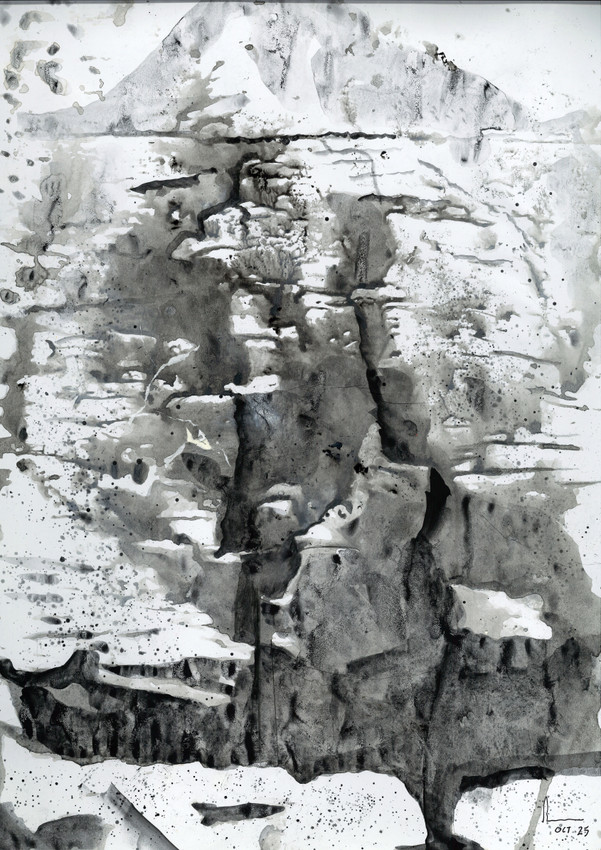 GLACIAR 01 pertenece a la serie Glaciares 2025 que versa sobre la realización de la pintura desde la acción y rastro que de ella queda en el soporte. En papel pegado sobre cartulina, se utiliza el goteo, la proyección de esmaltes, la transferencia por presión y la impresión de papel sobre papel... Estas técnicas por su naturaleza y ejecución dan lugar a unas piezas dinámicas que proyectan profundidad y tensión espacial.