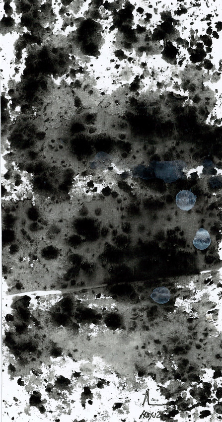 GLACIAR 02 pertenece a la serie Glaciares 2025 que versa sobre la realización de la pintura desde la acción y rastro que de ella queda en el soporte. En papel pegado sobre cartulina, se utiliza el goteo, la proyección de esmaltes, la transferencia por presión y la impresión de papel sobre papel... Estas técnicas por su naturaleza y ejecución dan lugar a unas piezas dinámicas que proyectan profundidad y tensión espacial.