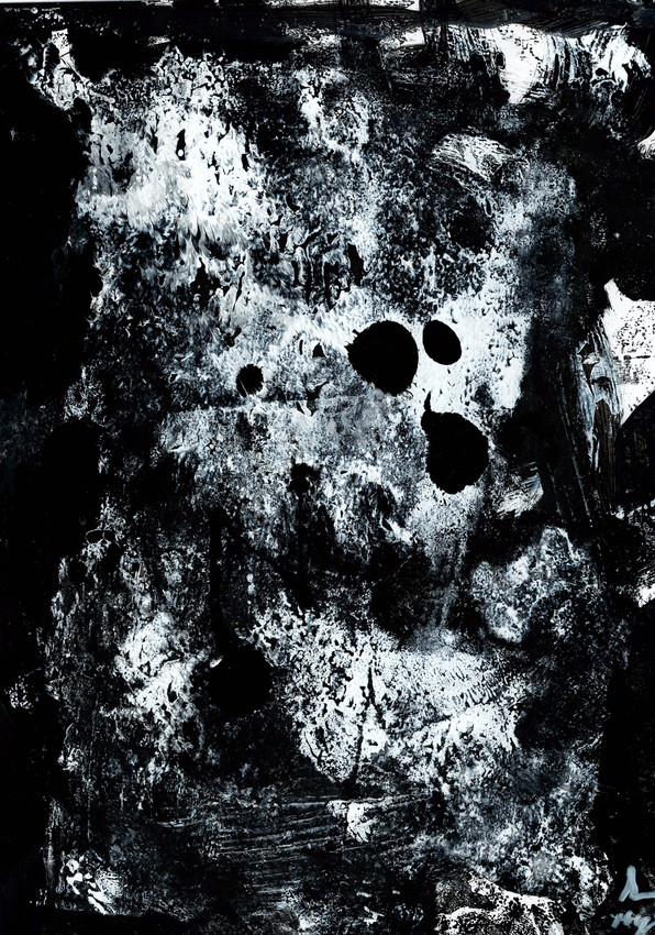 GLACIAR 03 se resuelve con pintura y esmalte acrílicos en blancos y negros, disponiendo un fondo informe desde el que emergen figuras igualmente informes que en su conjunto evocan gélidos glaciares en movimiento.