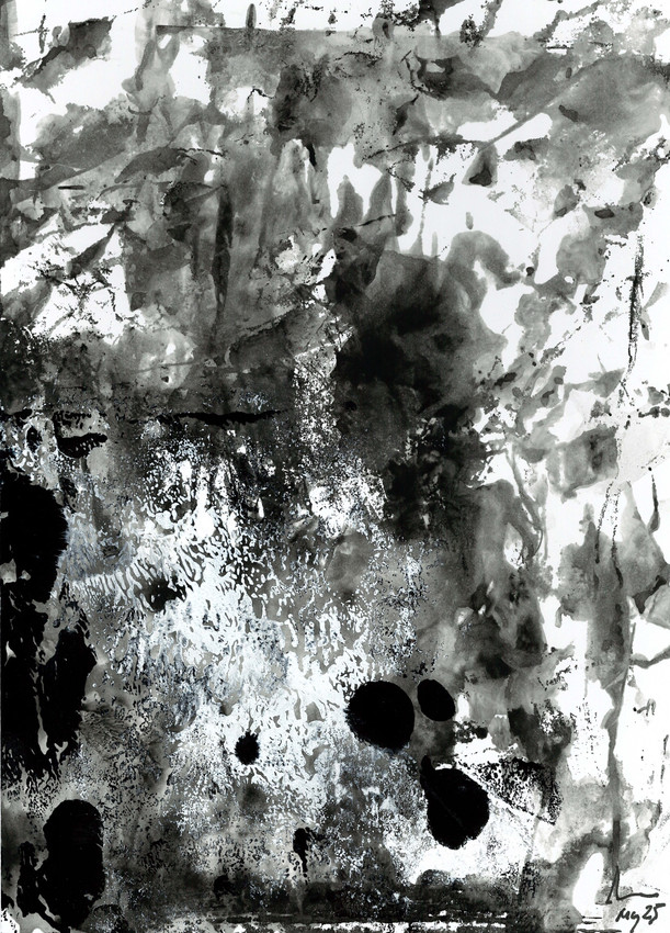 GLACIAR 06 pertenece a la serie Glaciares 2025 que versa sobre la realización de la pintura desde la acción y rastro que de ella queda en el soporte. En papel pegado sobre cartulina, se utiliza el goteo, la proyección de esmaltes, la transferencia por presión y la impresión de papel sobre papel... Estas técnicas por su naturaleza y ejecución dan lugar a unas piezas dinámicas que proyectan profundidad y tensión espacial.