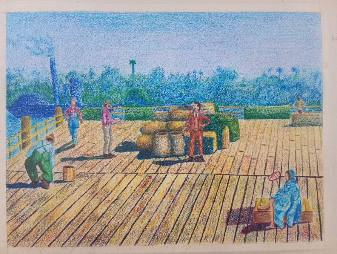 Desde un puerto por los años 1890 se aprecia varios trabajadores haciendo sus quehaceres y un hombre rico que está junto a lo que parece ser su carga o mercancía, y en un primer plano se ve a una chica de apariencia pobre que pide limosna.