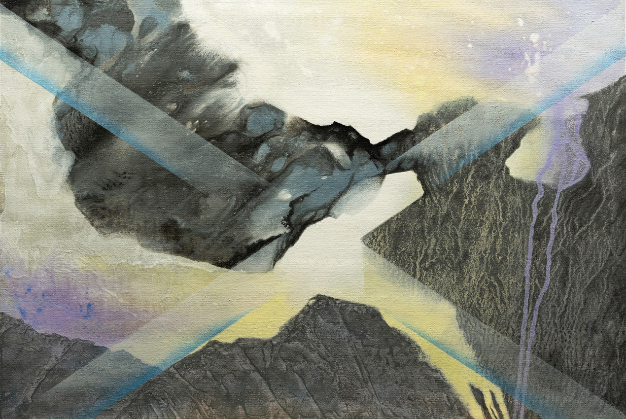 Es una pintura que traza un diálogo entre materia y luz, entre geometría y bruma. Las texturas y los efectos de agua parecen sugerir erosión y movimiento. Las intersecciones que recorren la imagen parecen congelar el tiempo en un paisaje que oscila entre lo real y lo imaginado. Esta obra invita al espectador a habitar el umbral entre lo visible y lo latente.