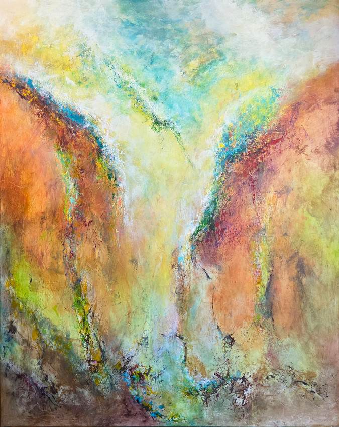 This vibrant abstract painting bursts with energy through swirling layers of earthy ochres, deep rusts, and vivid turquoise. Suggestive of a dynamic natural landscape, it evokes the powerful, untamed forces of nature reclaiming space. The upward movement and interplay of colors create a sense of renewal and unstoppable vitality.