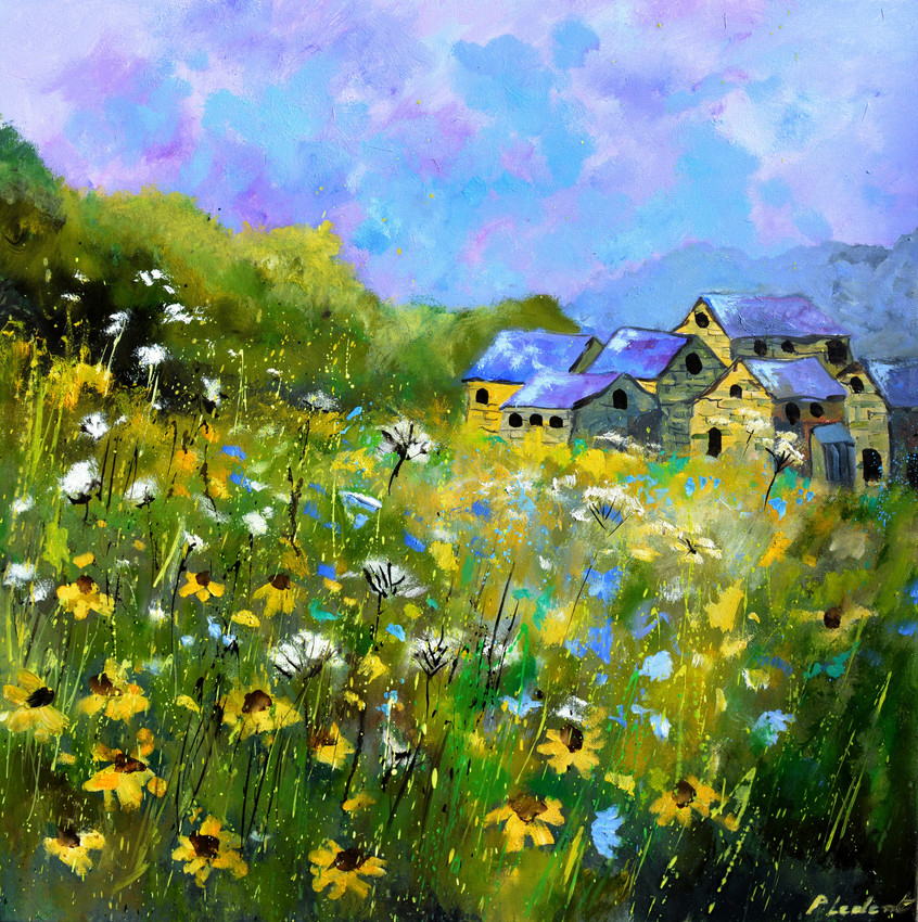 This artwork captures a bucolic landscape where a vibrant meadow of wildflowers rivals the beauty of the pastel sky. The bright yellows and pure whites of the flowers create a striking contrast with the deep green of the grass, bringing vibrant energy to the composition. In the background, stone houses with blue roofs nestle discreetly at the foot of the hills, suggesting a calming rural scene. The sky, in hues of lavender and blue, bears witness to dusk or dawn, enveloping everything in a tranquil and dreamy atmosphere. The bold use of color and the delicate interplay of light and shadow add dynamism, while the perspective directed towards the hills draws the eye, creating a captivating depth. This pastoral scene, both lively and serene, evokes a harmony between nature and human habitation.