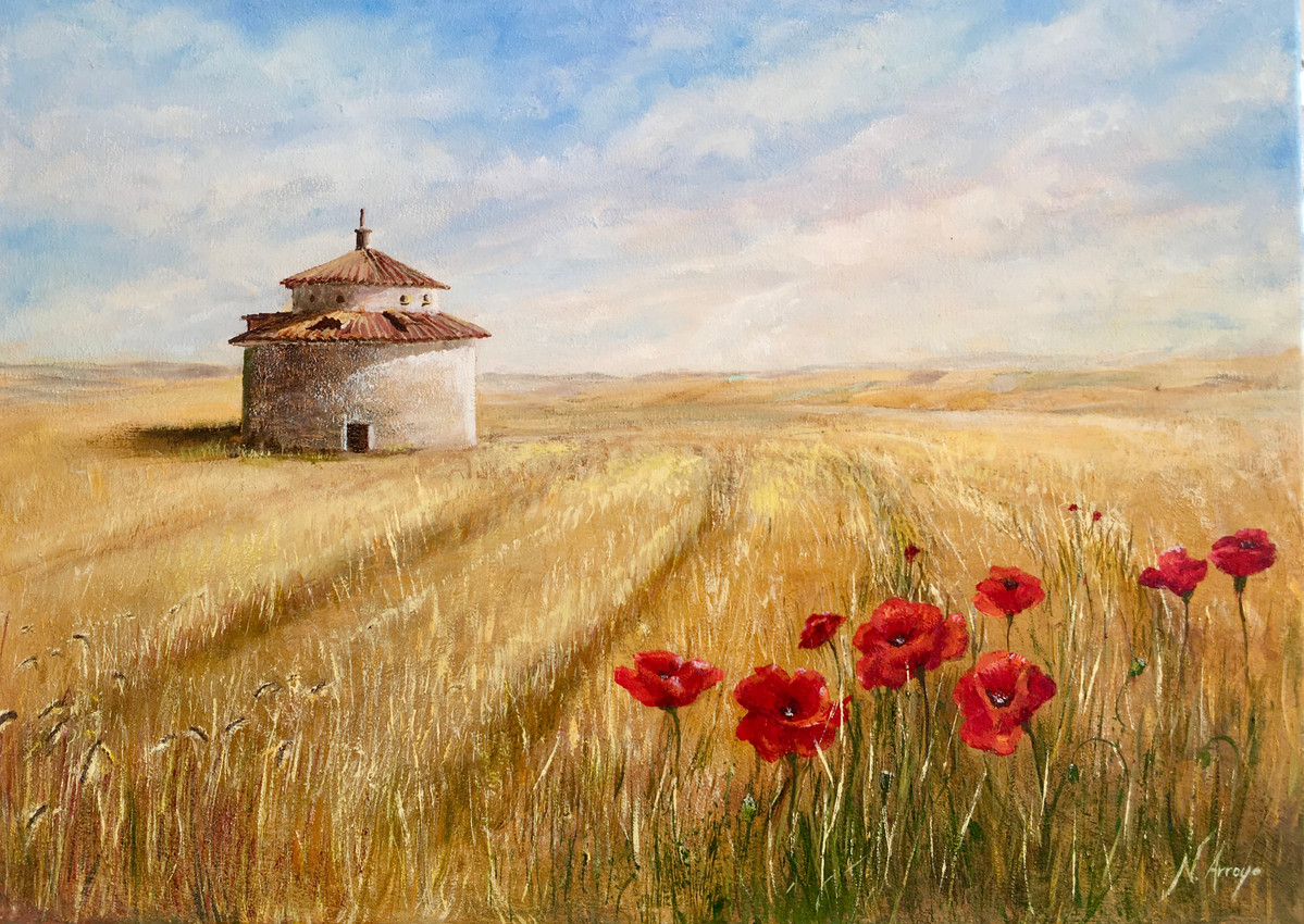 En este cuadro he querido rendir homenaje a la belleza sencilla del paisaje de tierra de campos. Pinté un mar de espigas doradas que se ondula suavemente bajo el cielo, guiando la mirada hacia el palomar que se alza solitario en el horizonte. Las líneas del campo arado ayudan a crear profundidad y equilibrio, mientras que en primer plano añadí algunas amapolas rojas para que aportaran contraste y vitalidad al conjunto. La luz clara del día se cuela entre el trigo y acaricia la pequeña construcción, creando una atmósfera cálida y tranquila. Mi intención es homenajear a los palomares como patrimonio de la arquitectura popular de tierra de campos.