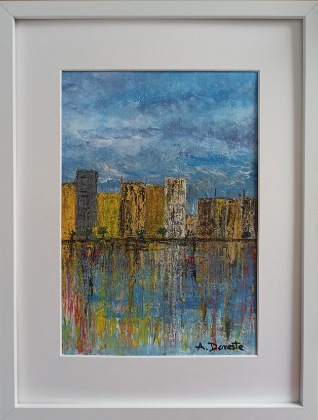 Este cuadro muestra un paisaje urbano moderno con un estilo abstracto e impresionista. Se observan varios edificios altos de colores amarillos, ocres, grises y marrones, alineados frente a un cielo azul con nubes. En la parte inferior, los edificios se reflejan en el agua, creando un efecto vibrante y colorido con trazos verticales en tonos azules, rojos, amarillos y blancos. La técnica empleada transmite dinamismo y textura, evocando la vitalidad de una ciudad contemporánea y el contraste entre lo estructurado (los edificios) y lo caótico (los reflejos).