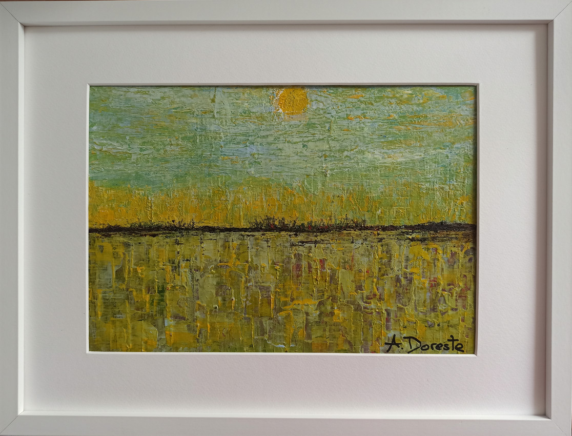 Este cuadro muestra un paisaje abstracto con un estilo impresionista. Los tonos predominantes son verdes, amarillos y dorados, con pinceladas gruesas que aportan textura. En la parte superior se distingue un cielo verdoso con matices azulados y un sol amarillo brillante que se percibe en el horizonte. La línea horizontal oscura separa el cielo de la tierra o el agua, dando la sensación de reflejo, como si fuera un campo inundado o una superficie espejada al atardecer.