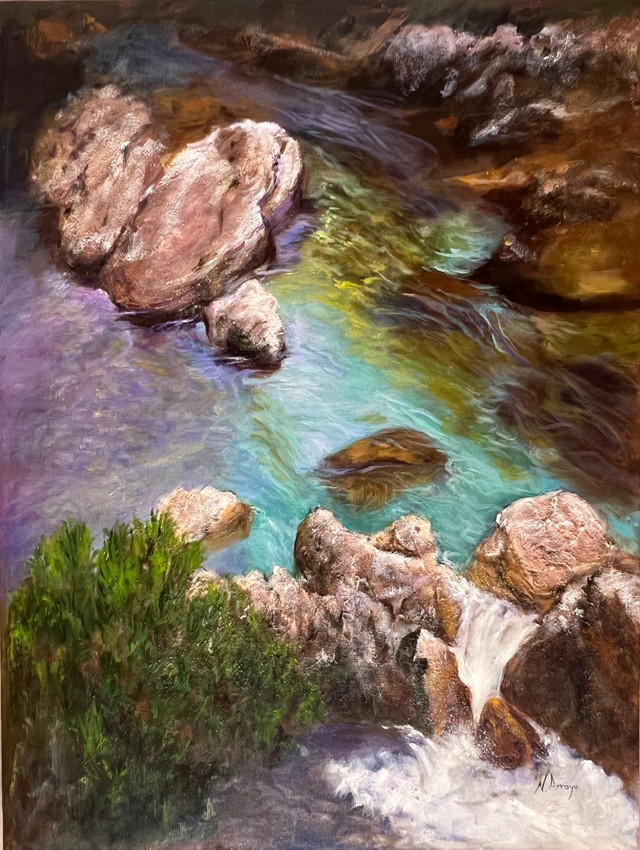 En este cuadro quise plasmar un rincón del río Cares, capturando la claridad y los matices de sus aguas. Me inspiré en la transparencia turquesa y violeta que toma la corriente al deslizarse entre las grandes rocas de tonos cálidos. Las formas irregulares de las piedras enmarcan el cauce y crean contrastes que resaltan la frescura del agua, mientras que en primer plano he representado la vegetación de la orilla para aportar un toque de vida y textura. Con pinceladas sueltas sugerí el movimiento y la espuma de la corriente para que el espectador casi pueda escuchar su murmullo y sentir el frescor que emana. Con esta pintura quiero invitar a quien la contemple a sumergirse en la belleza del río Cares y a compartir la sensación de pureza y serenidad que me transmite este lugar.