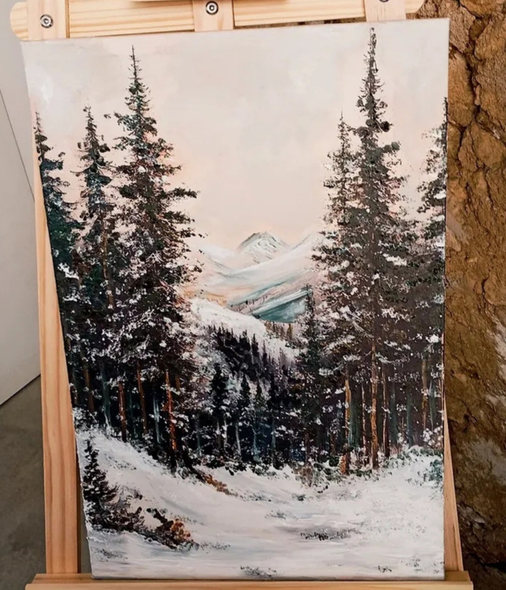 Esta es una obra original pintada totalmente a mano que captura la majestuosidad y la paz de un paisaje invernal. La pieza destaca por su textura vibrante, lograda a través de pinceladas cargadas que dan vida a los abetos cubiertos de nieve y a las montañas lejanas. Es ideal para quienes buscan transformar un espacio en un refugio de calma y naturaleza.