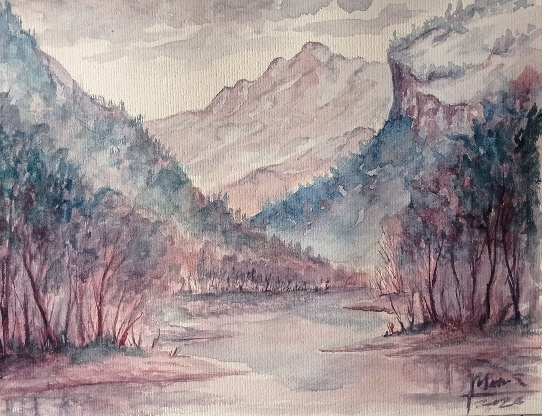 Con esta obra represento el fluir de un río, con una imponente montaña de fondo. La luz de un cielo nublado colorea el paisaje de azules verdosos y lacre, dando una impresión de tristeza.
