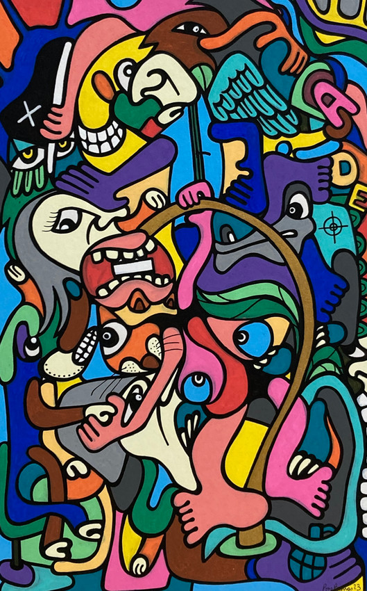 Esta obra de Philippe Pons despliega una composición vibrante y densa, donde formas figurativas y abstractas se entrelazan en un tapiz de color. Caras estilizadas, manos y pies emergen de un fondo saturado, delineados con audaces trazos negros. La paleta cromática es intensa, con azules, amarillos, rosas y verdes que chocan y se complementan, creando un mosaico visual de expresiones. Como dibujo, la técnica resalta la precisión del trazo y la vivacidad de los pigmentos, infundiendo a la pieza una energía dinámica y un ritmo visual cautivador.