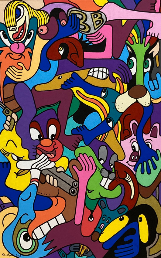 Este vibrante dibujo de Philippe Pons presenta una intrincada maraña de personajes de dibujos animados, donde figuras como Bugs Bunny y Yosemite Sam se entrelazan en una composición densa y dinámica. Colores vivos y planos, como púrpuras, azules y amarillos, definen cada forma con contornos negros audaces. La obra irradia una energía juguetona y caótica, con manos, pies y rostros superpuestos que crean una narrativa visual de enredo y movimiento constante. La técnica de dibujo resalta la vitalidad de cada elemento.