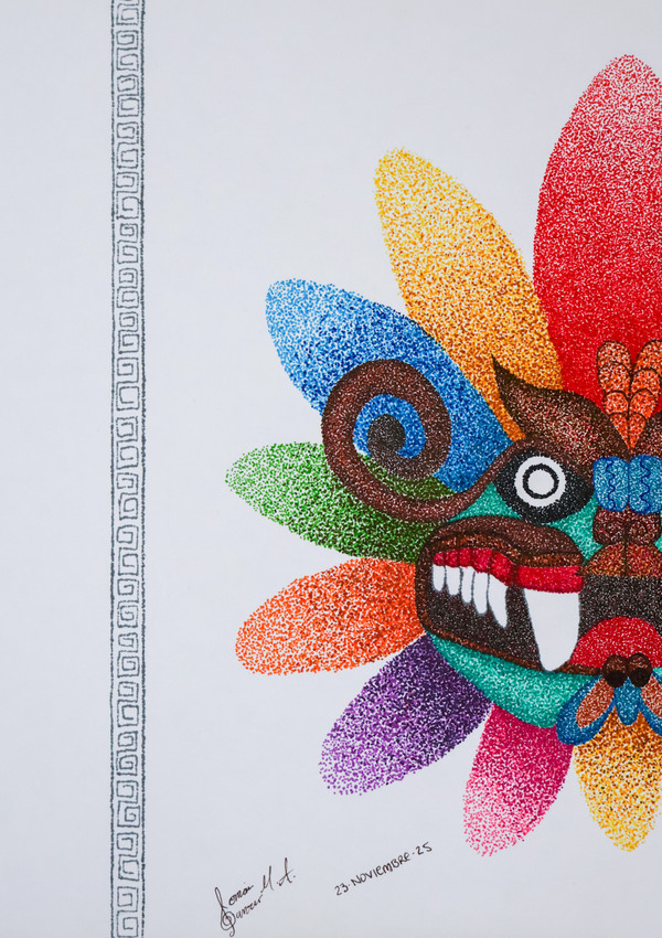 Quetzalcoatl, serpiente emplumada. Hecho con técnica de puntillismo con estilografos de colores.