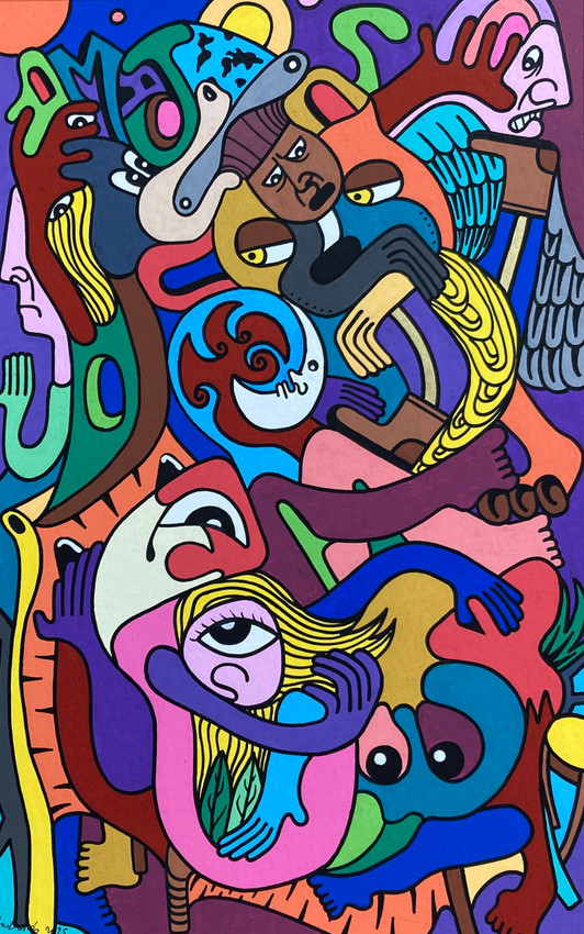 Esta obra de Philippe Pons presenta una composición vibrante y densamente entrelazada de figuras estilizadas. Las formas orgánicas, delineadas con contornos negros audaces, se superponen y abrazan, creando una narrativa visual de conexión. La paleta de colores es rica y saturada, con tonos de púrpura, azul, verde, rosa y amarillo que llenan cada sección, aportando dinamismo y profundidad a la pieza. Múltiples rostros y extremidades emergen del entramado, invitando a una exploración detallada de sus expresiones y gestos.