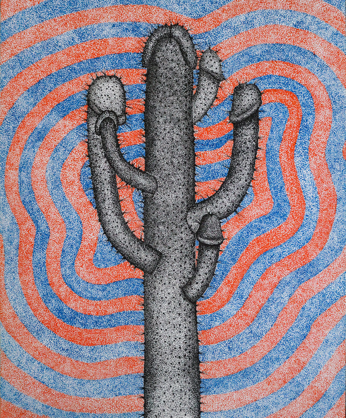 Puntillismo hecho con estilógrafos negros de ditintos mm y estilógrafos de color rojo y azul