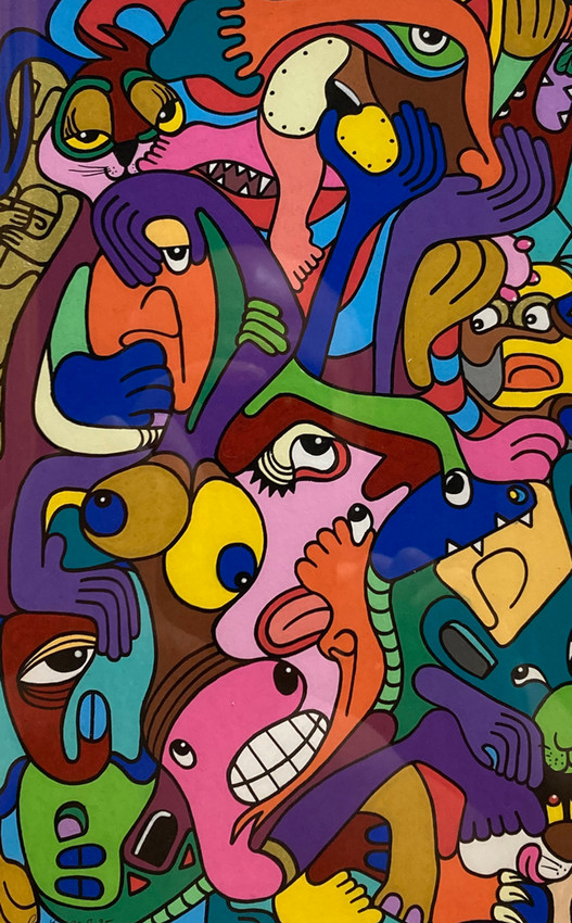 Esta vibrante obra de Philippe Pons presenta una intrincada composición de figuras entrelazadas, donde rostros, ojos y extremidades de estilo caricaturesco se fusionan en un tapiz visual. Predominan los colores vivos como azules, púrpuras, rosas y naranjas, delimitados por contornos negros que acentúan la energía de la escena. La mirada se pierde entre múltiples expresiones y gestos, creando una sensación de movimiento y dinamismo en este dibujo de gran impacto visual.