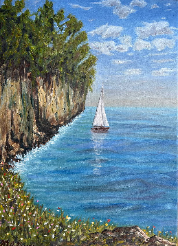 Escena marina que recrea un velero próximo a un acantilado en un luminoso día.