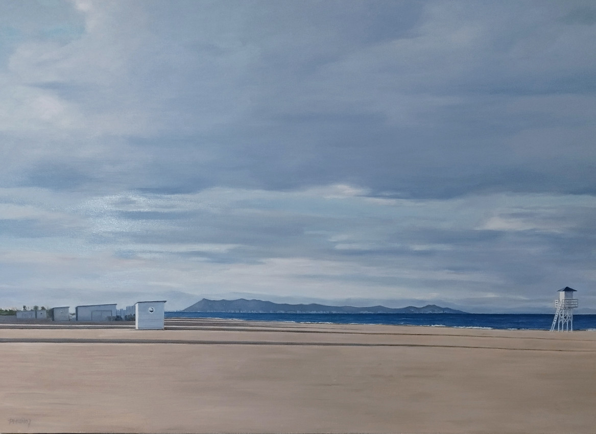 Atardecer en la Playa de Gandía (Valencia). Día nublado. Ha terminado la temporada de verano. Los kioscos de bebidas ya cerrados para todo el invierno. A la derecha un puesto de vigilancia de la playa.