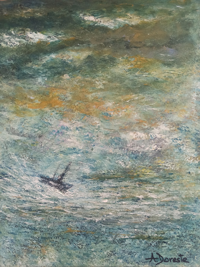 Este cuadro muestra un mar embravecido, pintado con una técnica de pinceladas sueltas y texturizadas que transmiten movimiento y turbulencia. Los tonos predominantes son verdes, azules y algunos toques de ocre, que evocan la fuerza y la profundidad del océano.