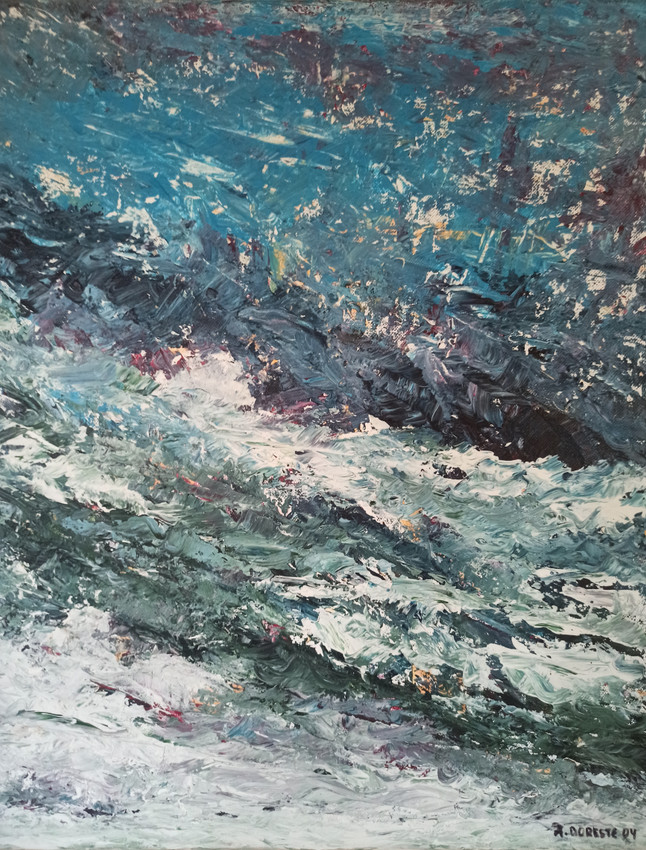 Este cuadro es una pintura de estilo expresionista, realizada con pinceladas densas y enérgicas que transmiten movimiento y fuerza. Predominan los tonos azules, verdes y blancos, que evocan el dinamismo y la bravura del mar embravecido. La técnica de empaste da textura a las olas, haciendo que casi se sientan el oleaje y la espuma golpeando con ímpetu.