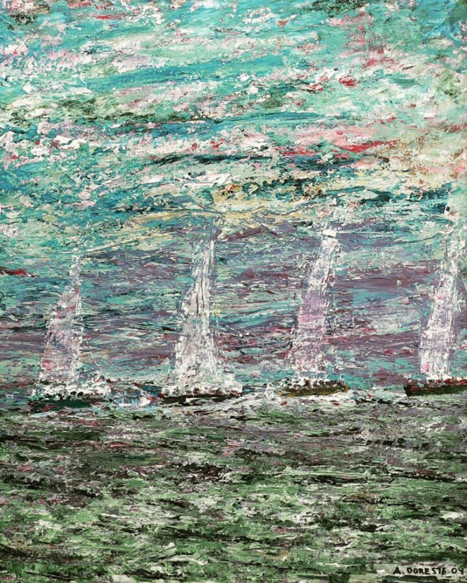 El cielo, compuesto por una vibrante mezcla de verdes, azules, rosados y blancos, aporta dinamismo y transmite la sensación de viento y velocidad, mientras que las velas parecen avanzar en formación, sugiriendo una competencia amistosa o una regata tradicional.