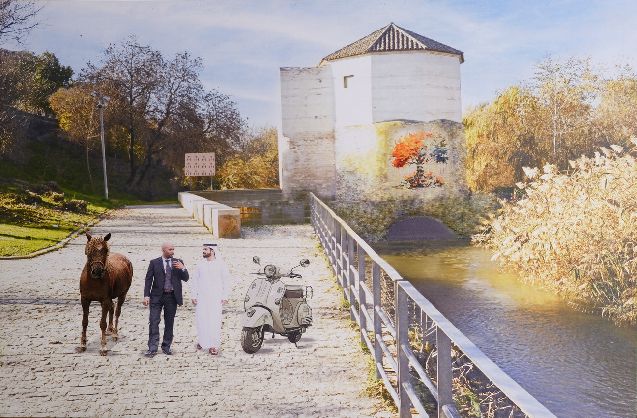 En Conversando, el diálogo se convierte en puente entre mundos. Dos figuras caminan lado a lado, acompañadas por un caballo y una motocicleta: símbolos del pasado y del presente que coexisten en armonía. La escena, bañada por una luz dorada, nos habla del encuentro, de la comunicación como camino hacia el entendimiento. El entorno natural y el mural del árbol, vibrante de color, sugieren que la conversación no solo une a las personas, sino también a la cultura y a la naturaleza que las rodea.