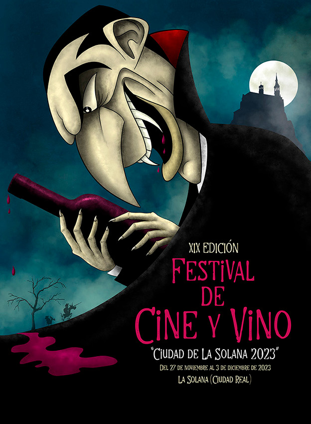 Presentado para el concurso de carteles del Festival de Cine y Vino de La Solana (Ciudad Real). Un fondo en el que aparece La Solana (Ciudad Real a modo de castillo. Drácula con la botella de vino y un Quijote y Sancho Panza dirigiéndose al castillo por caminos de Castilla La Mancha.