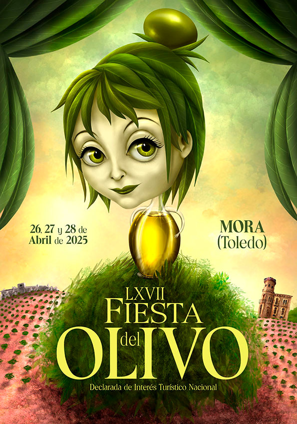 Diseñado a modo de teatro, en el que el telón abierto con los pliegues, lo forman las hojas del olivo. La chica como elemento principal y de fondo el campo de olivos de Mora (Toledo) con ese color rojizo de la tierra.