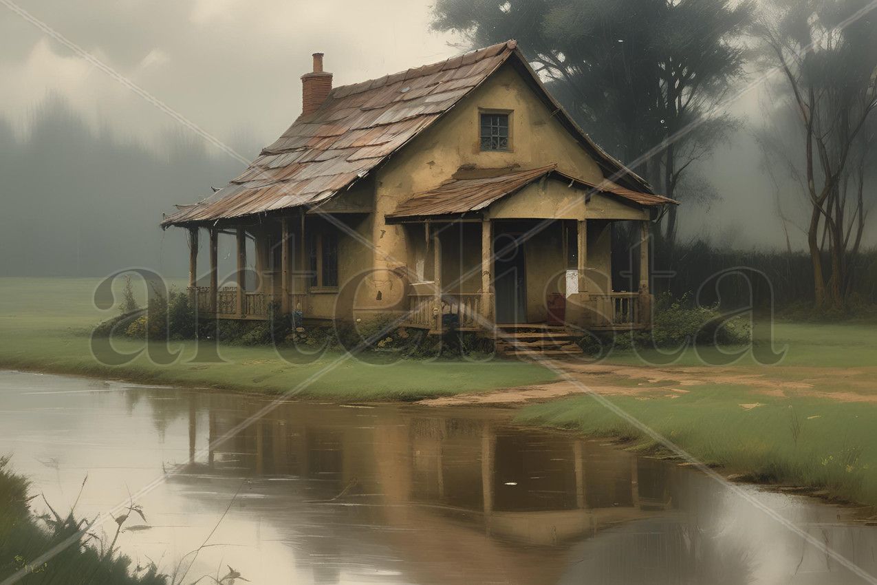 La escena muestra una casa antigua junto al agua, envuelta en neblina, ideal para ambientes minimalistas, modernos o rústicos, aportando armonía y carácter a espacios como salas, estudios, oficinas o galerías. Gracias a su alta resolución de 10630 × 7087 píxeles, es perfecta para impresión en gran formato, cuadros decorativos para sala, cuadros para pared y decoración artística moderna.