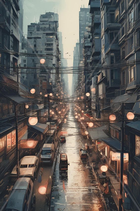 Luces Suspendidas en la Ciudad es una obra de arte digital realista con estética urbana contemporánea, que retrata una calle profunda entre edificios altos, donde las luces flotantes y los reflejos sobre el asfalto crean una atmósfera íntima, silenciosa y cinematográfica. La composición vertical enfatiza la perspectiva y la vida urbana moderna, convirtiéndola en una pieza ideal para cuadros de arte digital originales, decoración de pared moderna y espacios que buscan carácter, profundidad y estilo.
