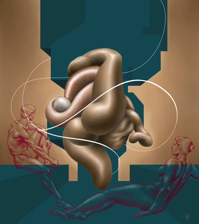 Composición intrigante donde dos figuras humanas estilizadas, una masculina sentada y una femenina reclinada, enmarcan una forma central orgánica y bulbosa. Esta estructura entrelazada, de tonos carnosos y apariencia inflada, flota sobre un fondo geométrico de bloques en tonos aguamarina y marrón. Líneas blancas curvas atraviesan la escena, añadiendo un dinamismo sutil que contrasta con la quietud de las figuras delineadas en rojo. La pieza explora la interacción entre lo figurativo y lo abstracto, lo orgánico y lo estructurado, creando un diálogo visual cautivador.