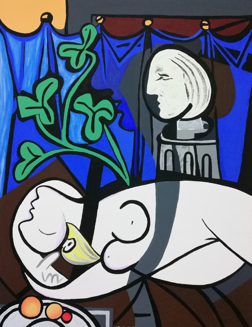 "Desnudo, hojas verdes y busto" es una pintura replica tributo al artista Pablo Piccaso del año 1932. La obra original es un retrató a su amante Marie-Thérèse Walter. Ésta pintura replica tributo, esta hecha en pintura acrílica. Las medidas son de 60 cm alto x 45 cm ancho. Es una pintura completamente hecha a mano y artesanal.