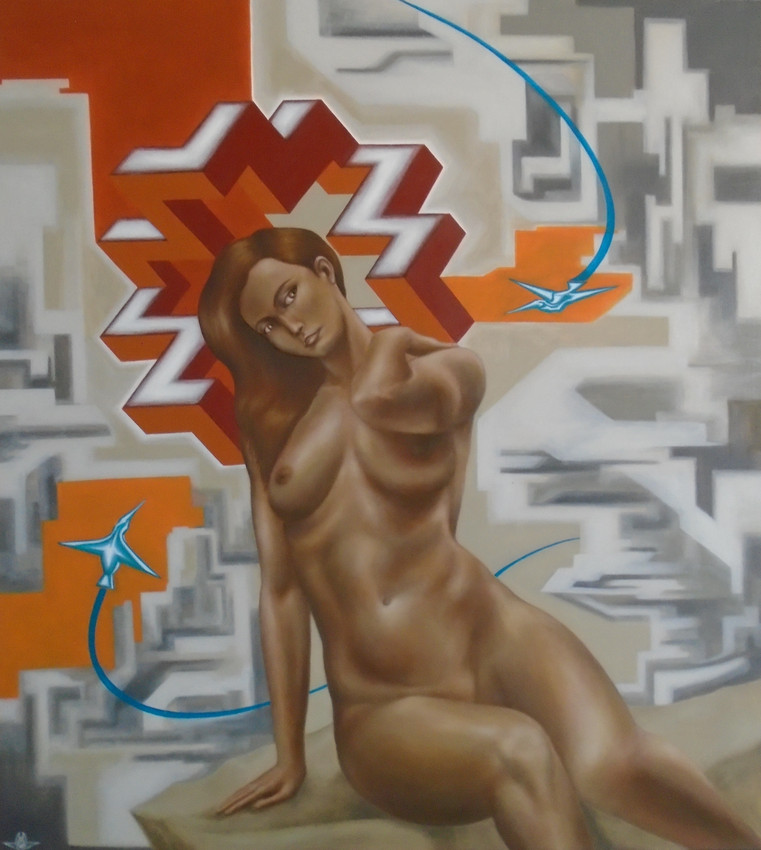 Seguna pieza de la serie pictórica "Flor y Colibrí" alusiva al cortejo y la seducción, donde los colibrís debutan por el amor de la flor y el acceso a su néctar.