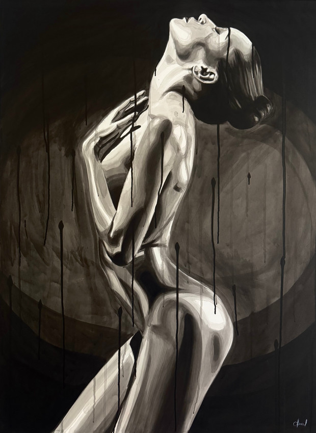 Una figura desnuda emerge del claroscuro, suspendida en un gesto de éxtasis o quebranto. El cuerpo, arqueado con tensión casi litúrgica, se convierte en altar de emociones contenidas. Las manos, posadas sobre el pecho y el vientre, evocan un rito íntimo: el tacto como testimonio, el cuerpo como archivo. La paleta monocromática acentúa la dualidad entre luz y sombra, mientras los trazos verticales de pintura negra descienden como lágrimas o invocaciones, marcando el tiempo de la imagen. La composición sugiere una ofrenda silenciosa, un instante capturado entre lo humano y lo mítico. El fondo oscuro no es vacío, sino umbral: un espacio donde la figura se convierte en símbolo, donde el dolor y la belleza se confunden.