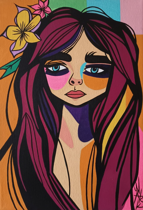 "Retrato de la introspección. Una joven de mirada serena y cabello caoba intenso descansa sobre un fondo vibrante, donde el anaranjado, azul, rosa y verde chocan, simbolizando un mundo interior complejo y colorido frente a una calma exterior. Una obra que equilibra la melancolía y la vitalidad."